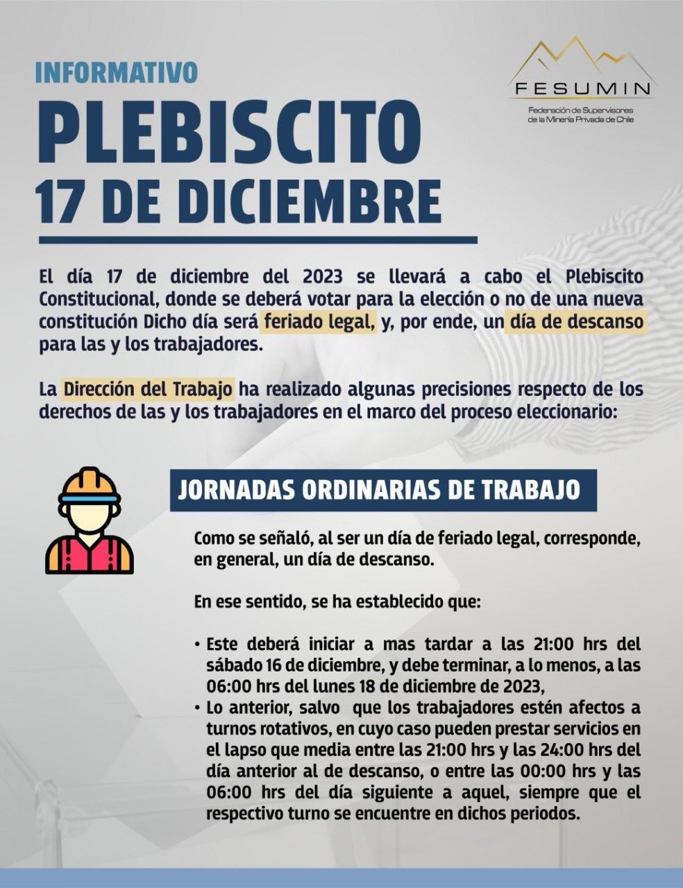 El día 17 de diciembre del 2023 se llevará a cabo el Plebiscito Constitucional, donde se deberá votar para la elección o no de una nueva constitución. Dicho día será feriado legal, y, por ende, un día de descanso para las y los trabajadores.
