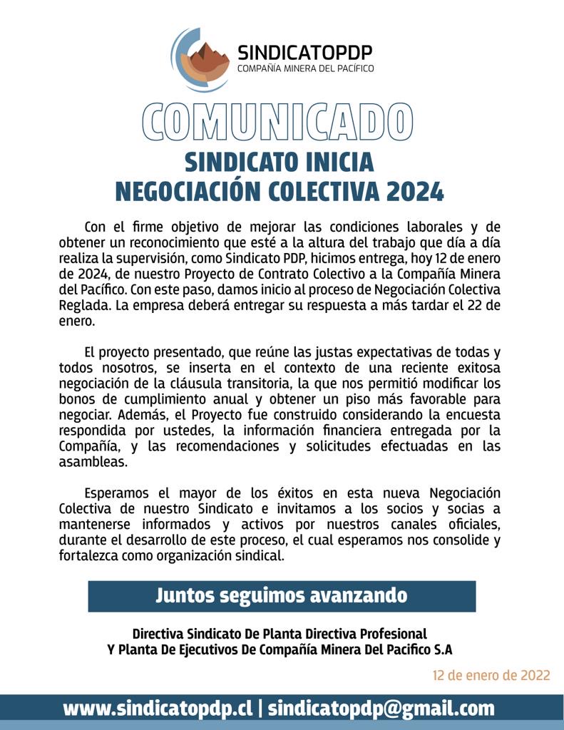 Hoy, representantes del Sindicato PDP llevaron a cabo la entrega oficial del proyecto de contrato colectivo a la compañía en La Serena. Simultáneamente, se presentó el mismo documento ante la Inspección Provincial del Trabajo. Este acto marca el inicio formal del primer proceso de negociación del sindicato para este período.