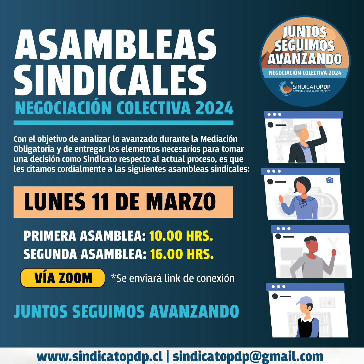 Conforme se acerca el fin de la Mediación ante la Dirección del Trabajo, el Sindicato realizará a Asambleas Sindicales el próximo lunes 11 de marzo, con el fin de dar a conocer lo trabajado durante esta semana y poder decidir, entre todas y todos, el curso final de esta Negociación Colectiva.
