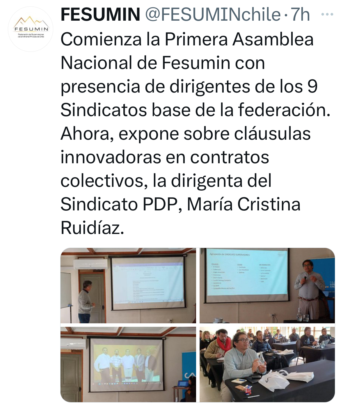Durante esta jornada, nuestro Sindicato ha tenido una destacada participación en el Encuentro Nacional de la Federación de Supervisores de la Mineria Privada -FESUMIN-, a través de nuestra directora Maria Ruidiaz, quien expuso las cláusulas de nuestro nuevo Contrato Colectivo, recientemente obtenido en la última Negociación Colectiva.